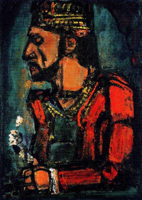I chose to do a study of Rouault’s The Old King. The original painting is 30″ x 21″. My canvas is 30″ x 24″, pretty close. The painting represents kingship without reference to a specific historical figure and was painted during WWI. My favorite part – besides the thick brushwork and glowing color – is that the king is holding flowers, not a weapon or sceptre of any kind. Can you imagine a portrait of one of our leaders today holding white flowers like that?